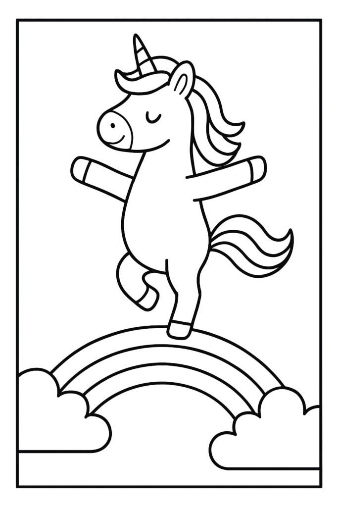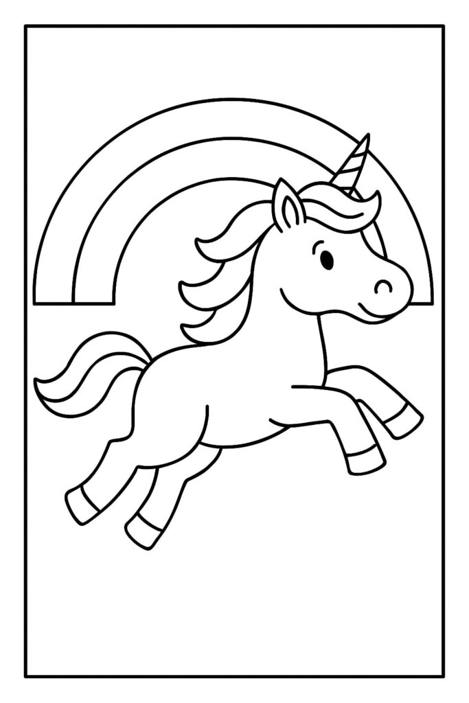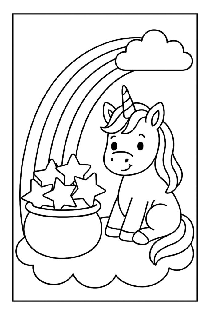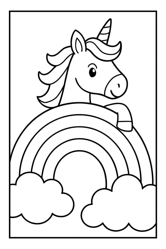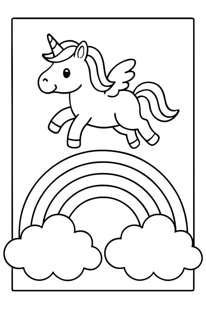 Een kleurplaat eenhoorn regenboog met extra details zoals bloemen, sterren, of een landschap op de achtergrond. Kinderen kunnen experimenteren met kleurpatronen en leren om binnen de lijnen te blijven.