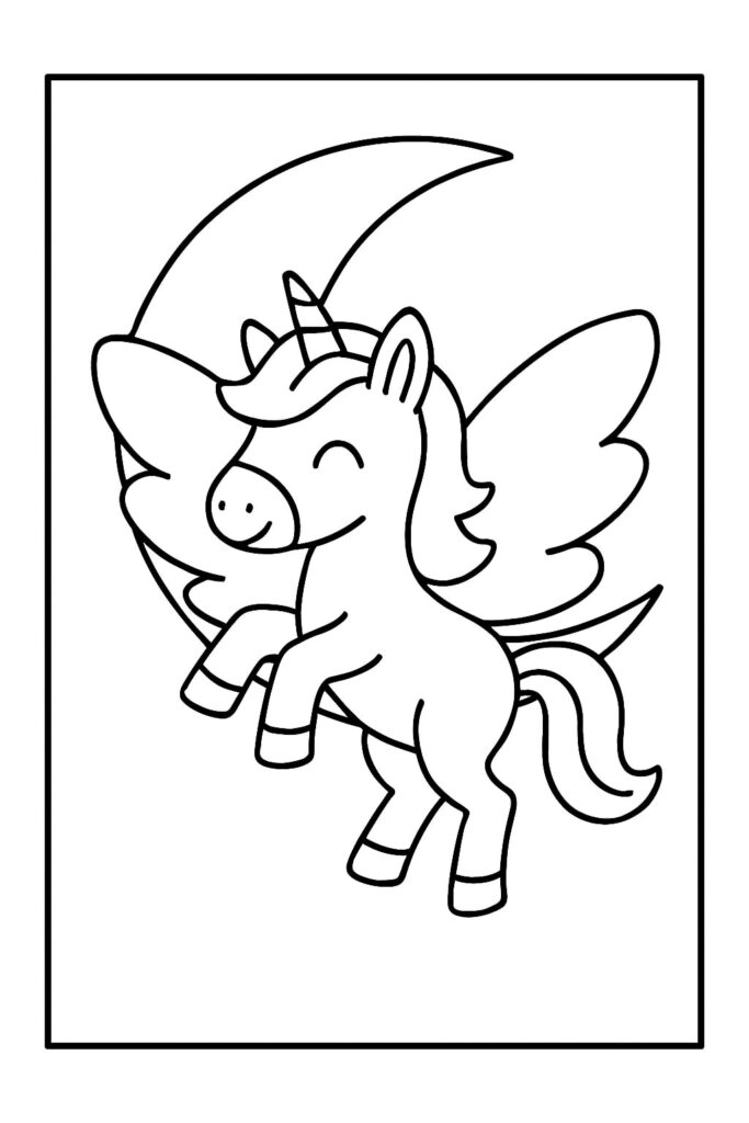 Een unicorn kleurplaat met fee die door de sterrenhemel vliegt of op een maan zit. Deze zijn geschikt voor iets oudere kinderen, omdat ze meer details en schaduw bieden. Ideaal om met kleurverloop en blending te experimenteren.