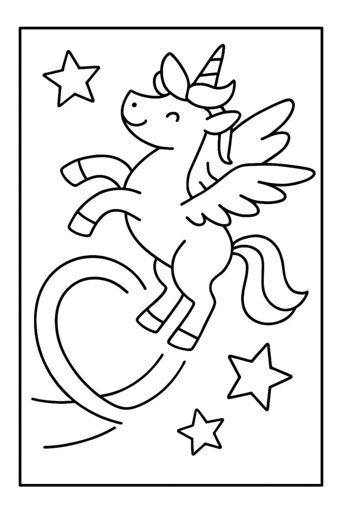 Gemiddeld detail: vleugels in 3–5 segmenten, wolkenband en enkele sterren. Simpele patroonopdrachten: “Hoorn in ABAB-strepen”, “Veren warm/koud afwisselen”. Een kleurplaat vliegende unicorn in kleur-op-nummervorm helpt bij getal-kleurkoppeling en aandacht.
